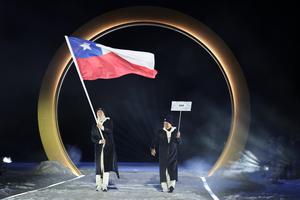 (260207) -- PREDAZZO, 7 febrero, 2026 (Xinhua) -- Imagen del 6 de febrero de 2026 de la delegación de Chile desfilando hacia el Estadio de Saltos de Esquí de Predazzo durante la ceremonia de inauguración de los Juegos Olímpicos de Invierno Milán-Cortina 2026, en Predazzo, Italia. (Xinhua/Huang Wei) (oa) (da)