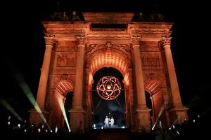 (260207) -- MILAN, 7 febrero, 2026 (Xinhua) -- Imagen del 6 de febrero de 2026 de los portadores de la antorcha Deborah Compagnoni (d) y Alberto Tomba, encendiendo el pebetero de los Juegos Olímpicos de Invierno Milán-Cortina 2026, en el Arco della Pace, en Milán, Italia. (Xinhua/Jamie Squire/Pool) (oa) (da)