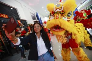 (260208) -- QUITO, 8 febrero, 2026 (Xinhua) -- Imagen del 7 de febrero de 2026 de una mujer tomándose una fotografía junto a un bailarín de la danza china de leones y dragones durante un Festival Cultural con motivo de la próxima celebración del Año Nuevo chino, en la ciudad de Quito, capital de Ecuador. La tradicional danza china de leones y dragones dio la bienvenida a un Festival Cultural en la ciudad ecuatoriana de Quito, organizado por la Academia de Lengua China Siyuan, con motivo de la próxima celebración del Año Nuevo chino o Fiesta de la Primavera, la festividad tradicional más importante del país asiático. (Xinhua/Ricardo Landeta) (rl) (oa) (da)