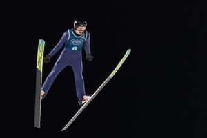 (260209) -- PREDAZZO, 9 febrero, 2026 (Xinhua) -- Imagen del 8 de febrero de 2026 de Kaimar Vagul, de Estonia, compitiendo durante el segundo Entrenamiento Oficial de trampolín normal masculino de salto de esquí en los Juegos Olímpicos de Invierno Milán-Cortina 2026, en Predazzo, Italia. (Xinhua/Huang Wei) (oa) (ah) (vf)