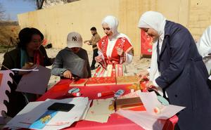 (260208) -- AMAN, 8 febrero, 2026 (Xinhua) -- Imagen del 7 de febrero de 2026 de visitantes probando el grabado en madera en una feria cultural y turística china, en Amán, Jordania. (Xinhua/Mohammad Abu Ghosh) (oa) (ah)