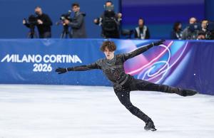 (260211) -- MILAN, 11 febrero, 2026 (Xinhua) -- Imagen del 10 de febrero de 2026 de Mikhail Shaidorov, de Kazajistán, realizando una presentación durante la competencia del programa corto de patinaje individual masculino de patinaje artístico en los Juegos Olímpicos de Invierno Milán-Cortina 2026, en Milán, Italia. (Xinhua/Li Ming) (ah) (ra) (vf)