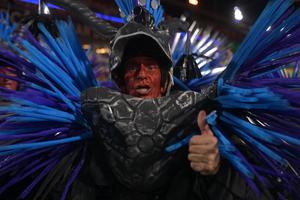 (260216) -- RIO DE JANEIRO, 16 febrero, 2026 -- Imagen del 15 de febrero de 2026 de un juerguista de la Escuela de Samba Académicos de Niterói participando en el desfile durante el Carnaval 2026, en el sambódromo Marquês de Sapucaí, en Río de Janeiro, Brasil. La primera noche de desfiles del Carnaval de Río de Janeiro transformó el Sambódromo en un río de luz, música y emoción que pareció no tener orillas. (Xinhua/Lucio Tavora) (lt) (rtg) (ah) (vf)
