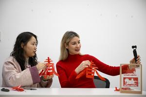 (260216) -- SHANGHAI, 16 febrero, 2026 (Xinhua) -- Imagen del 6 de febrero de 2026 de Aleksandra Antonenko (d), grabando videos cortos sobre la experiencia del corte de papel, en Shanghai, en el este de China. Aleksandra Antonenko se mudó de Rusia para realizar su doctorado en la Universidad Jiao Tong de Shanghai en 2022. También comenzó a mostrar el encanto de la vida cotidiana en China al mundo con videos cortos. (Xinhua/Chen Haoming) (rtg) (ah) (vf)