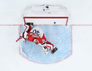 (260215) -- MILAN, 15 febrero, 2026 (Xinhua) -- Imagen del 14 de febrero de 2026 de Mads Sogaard, guardameta de Dinamarca, fallando en una parada durante el partido del grupo C de la ronda preliminar masculina entre Estados Unidos y Dinamarca de hockey sobre hielo en los Juegos Olímpicos de Invierno Milán-Cortina 2026, en Milán, Italia. (Xinhua/Zhang Haofu) (oa) (da)