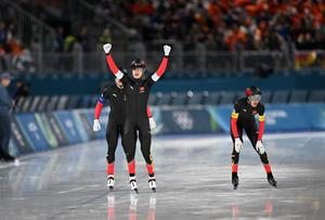 (260215) -- MILAN, 15 febrero, 2026 (Xinhua) -- (De izq. a der.) Li Wenhao, Liu Hanbin, y Wu Yu, de China, festejan al término de los cuartos de final de persecución por equipos masculino de patinaje de velocidad en los Juegos Olímpicos de Invierno Milán-Cortina 2026, en Milán, Italia, el 15 de febrero de 2026. (Xinhua/Wu Wei) (rtg) (ah)