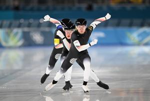 (260215) -- MILAN, 15 febrero, 2026 (Xinhua) -- Atletas de Alemania, compiten durante los cuartos de final de persecución por equipos masculino de patinaje de velocidad en los Juegos Olímpicos de Invierno Milán-Cortina 2026, en Milán, Italia, el 15 de febrero de 2026. (Xinhua/Wu Wei) (ah)