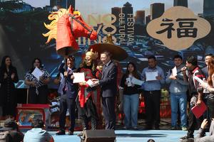(260215) -- CIUDAD DE MEXICO, 15 febrero, 2026 -- Imagen del 14 de febrero de 2026 del embajador de China en México, Chen Daojiang (d-frente), reaccionando durante el Festival Cultural del Año Nuevo chino en el Centro Nacional de las Artes (Cenart), en la Ciudad de México, capital de México. El Cenart de la capital mexicana celebró el sábado la quinta edición del Festival Cultural del Año Nuevo chino, que en esta ocasión da la bienvenida al Año del Caballo. (Xinhua/Daniel Augusto) (fc) (rtg) (ah)