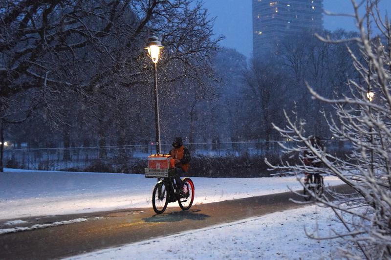 (260216) -- LA HAYA, 16 febrero, 2026 (Xinhua) -- Imagen del 15 de febrero de 2026 de un repartidor circulando en una bicicleta bajo la nieve, en La Haya, Países Bajos. (Xinhua/Shao Haijun) (rtg) (ah) (vf)