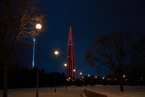 (260216) -- SAN PETERSBURGO, 16 febrero, 2026 (Xinhua) -- Imagen del 15 de febrero de 2026 del Centro Lakhta, el edificio más alto en Rusia, iluminado en "rojo China" para festejar el Año Nuevo chino, en San Petersburgo, Rusia. (Xinhua/Guo Feizhou) (rtg) (ah)