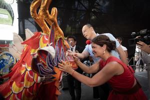 (260217) -- BUENOS AIRES, 17 febrero, 2026 (Xinhua) -- Imagen del 16 de febrero de 2026 del consejero de la Embajada de China en Argentina Ren Qiang (2-d), y Gabriela Ricardes (d), ministra de cultura de la ciudad de Buenos Aires, realizando el tradicional clavado de pupilas al dragón, durante las celebraciones por el Año Nuevo chino, en el Barrio Chino, en la ciudad de Buenos Aires, capital de Argentina. El Barrio Chino de Buenos Aires celebró el lunes la llegada del Año Nuevo chino o Fiesta de la Primavera con un multitudinario evento lleno de color y emoción que ofreció arte, cultura, música, moda, baile y gastronomía de China. (Xinhua/Martín Zabala) (mz) (oa) (ah) (vf)