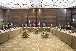 (260217) -- GINEBRA, 17 febrero, 2026 (Xinhua) -- Imagen del 17 de febrero de 2026 de la escena de la nueva ronda de conversaciones trilaterales entre Ucrania, Estados Unidos y Rusia, en Ginebra, Suiza. Una nueva ronda de conversaciones trilaterales entre Ucrania, Estados Unidos y Rusia comenzó el martes en Ginebra. Se espera que las negociaciones de dos días, celebradas a puertas cerradas, aborden cuestiones territoriales, asuntos militares, preocupaciones políticas y económicas, así como arreglos de seguridad, informó la agencia estatal de noticias TASS de Rusia. (Xinhua/Beatrice Devenes/Departamento Federal de Asuntos Exteriores de Suiza) (jg) (ra) (vf)