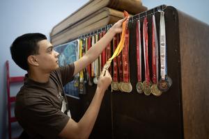 (260218) -- BUENOS AIRES, 18 febrero, 2026 (Xinhua) -- Imagen del 4 de febrero de 2026 de Marcos González, un joven de 14 años de edad y practicante de wushu, ordenando las medallas obtenidas en torneos, en su habitación, en la ciudad de Buenos Aires, capital de Argentina. La milenaria cultura china y sus múltiples manifestaciones, como la Fiesta de la Primavera, el arte, la música, la danza y el deporte marcial, atrae y enamora a los jóvenes de Argentina, que se suman con entusiasmo, respeto y admiración a la práctica de distintas disciplinas, costumbres y celebraciones originarias del país asiático. (Xinhua/Martín Zabala) (mz) (ah) (ra) (ce)