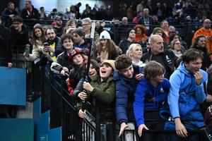 (260218) -- MILAN, 18 febrero, 2026 (Xinhua) -- Imagen del 17 de febrero de 2026 de un niño recibiendo un palo de hockey que le regaló un jugador al término del partido de clasificación masculina entre Suecia y Letonia de hockey sobre hielo en los Juegos Olímpicos de Invierno Milán-Cortina 2026, en Milán, Italia. (Xinhua/Zhang Haofu) (ah) (ra) (ce)