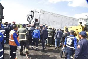 (260219) -- EL CAIRO, 19 febrero, 2026 (Xinhua) -- Imagen del 19 de febrero de 2026 del sitio de un accidente luego de la colisión de dos camiones, en la provincia de Puerto Said, en el noreste de El Cairo, Egipto. Al menos 18 personas murieron y otras tres resultaron heridas el jueves en una colisión entre dos camiones en la provincia de Puerto Said, al noreste de El Cairo, de acuerdo con un comunicado de la provincia de Dakahlia, en el norte de Egipto. (Xinhua/Str) (da) (ra) (ce)