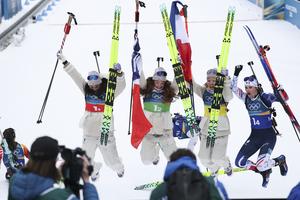 (260219) -- ANTERSELVA, 19 febrero, 2026 (Xinhua) -- Imagen del 18 de febrero de 2026 del equipo de Francia festejando al término del relevo 4x6 km femenino de biatlón en los Juegos Olímpicos de Invierno Milán-Cortina 2026, en Anterselva, Italia. (Xinhua/Zhang Tao) (rtg) (ra) (ce)