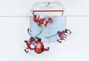 (260219) -- MILAN, 19 febrero, 2026 (Xinhua) -- Imagen del 18 de febrero de 2026 de jugadores de ambos equipos compitiendo por el disco durante los cuartos de final de la clasificatoria masculina entre Canadá y República Checa de hockey sobre hielo en los Juegos Olímpicos de Invierno Milán-Cortina 2026, en Milán, Italia. (Xinhua/Zhang Haofu) (jg) (ah) (vf)