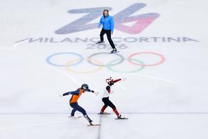 (260219) -- MILAN, 19 febrero, 2026 (Xinhua) -- Imagen del 18 de febrero de 2026 de Steven Dubois (d), de Canadá, cruzando la línea de meta durante la final A de 500 m masculinos de patinaje de velocidad en pista corta en los Juegos Olímpicos de Invierno Milán-Cortina 2026, en Milán, Italia. (Xinhua/Chen Yichen) (da) (ra) (vf)