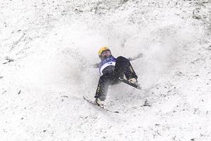 (260220) -- LIVIGNO, 20 febrero, 2026 (Xinhua) -- Li Tianma, de China, se cae en la nieve durante la final 1 de aerials masculino de esquí acrobático en los Juegos Olímpicos de Invierno Milán-Cortina 2026, en Livigno, Italia, el 20 de febrero de 2026. (Xinhua/Wu Huiwo) (rtg) (ra) (ce)