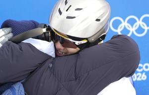 (260220) -- LIVIGNO, 20 febrero, 2026 (Xinhua) -- Wang Xindi (d), de China, abraza a su esposa Xu Mengtao, al término de la final 2 de aerials masculino de esquí acrobático en los Juegos Olímpicos de Invierno Milán-Cortina 2026, en Livigno, Italia, el 20 de febrero de 2026. (Xinhua/Wu Huiwo) (rtg) (ra) (vf)