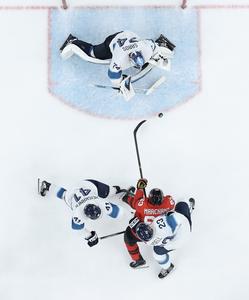 (260220) -- MILAN, 20 febrero, 2026 (Xinhua) -- Brad Marchand (c), de Canadá, dispara el disco durante el partido de semifinal de la clasificación masculina entre Canadá y Finlandia de hockey sobre hielo en los Juegos Olímpicos de Invierno Milán-Cortina 2026, en Milán, Italia, el 20 de febrero de 2026. (Xinhua/Zhang Haofu) (rtg) (ra) (ce)