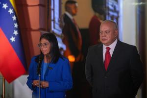 (260220) -- CARACAS, 20 febrero, 2026 (Xinhua) -- Imagen del 19 de febrero de 2026 de la presidenta encargada venezolana, Delcy Rodríguez (i), hablando durante una conferencia de prensa después de promulgar la Ley de Amnistía para la Convivencia Democrática, en Caracas, Venezuela. Rodríguez promulgó el jueves la recién aprobada Ley de Amnistía para la Convivencia Democrática que, a su juicio, significa "una nueva etapa" en la vida nacional del país sudamericano. (Xinhua/Marcos Salgado) (ms) (oa) (ra) (ce)