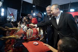 (260222) -- LA PLATA, 22 febrero, 2026 (Xinhua) -- Imagen del 21 de febrero de 2026 del embajador de China en Argentina, Wang Wei (d), y el intendente de la ciudad de La Plata, Julio Alak (2-d), realizando el tradicional "clavado de pupilas" para despertar al dragón durante las celebraciones por el Año Nuevo chino en la Plaza Moreno, en la ciudad de La Plata, Argentina. La ciudad argentina de La Plata se sumó el sábado a los festejos por el Año Nuevo chino con un multitudinario y colorido festival frente a la emblemática catedral de la ciudad. (Xinhua/Martín Zabala) (mz) (oa) (da)