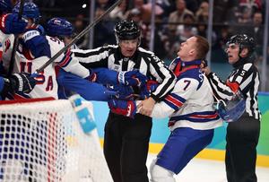 (260221) -- MILAN, 21 febrero, 2026 (Xinhua) -- Imagen del 20 de febrero de 2026 de Brady Tkachuk (2-d), de Estados Unidos, enfrentándose con jugadores de Eslovaquia durante el partido de semifinal de la clasificación masculina de hockey sobre hielo entre Estados Unidos y Eslovaquia en los Juegos Olímpicos de Invierno Milán-Cortina 2026, en Milán, Italia. (Xinhua/Wang Kaiyan) (oa) (da)