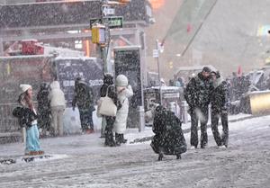 (260223) -- NUEVA YORK, 23 febrero, 2026 (Xinhua) -- Imagen del 22 de febrero de 2026 de personas vistas en la nieve en Times Square, en Nueva York, Estados Unidos. El alcalde de la Ciudad de Nueva York, Zohran Mamdani, declaró el domingo el estado de emergencia y emitió una prohibición de viajes mientras una tormenta invernal azotaba la región, provocando cientos de cancelaciones de vuelos. (Xinhua/Zhang Fengguo) (oa) (ah) (vf)