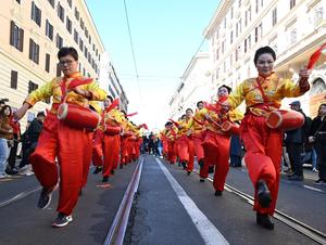 (260223) -- ROMA, 23 febrero, 2026 (Xinhua) -- Imagen del 22 de febrero de 2026 de mujeres realizando una presentación de una danza de tambores, durante un desfile del Año Nuevo chino, en Roma, Italia. (Xinhua/Elisa Lingria) (rtg) (ah) (vf)