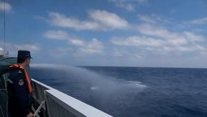 (260225) -- MAR MERIDIONAL DE CHINA, 25 febrero, 2026 (Xinhua) -- Captura de pantalla del 21 de febrero de 2026 del buque Hebao de la Guardia Costera de China (GCCh) realizando disparos de cañón de agua de advertencia contra barcos filipinos que ingresan ilegalmente a las aguas territoriales chinas de Huangyan Dao, en el Mar Meridional de China. Varios barcos filipinos se reunieron y entraron ilegalmente en las aguas cercanas a Huangyan Dao alrededor del mediodía del 21 de febrero. Los barcos fueron expulsados legalmente por la formación del buque Wanshan de la GCCh. (Xinhua) (ah) (ra) (vf)