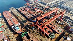 (260225) -- BEIJING, 25 febrero, 2026 (Xinhua) -- Vista aérea tomada con un dron el 25 de febrero de 2026 de la Base Industrial de Construcción Naval e Ingeniería Marina de la Bahía de Haixi, en Qingdao, en la provincia de Shandong, en el este de China. Con la reanudación de la producción tras las vacaciones de la Fiesta de la Primavera, las fábricas y empresas de todo el país están operando a todo vapor para atender los pedidos y aumentar la producción. (Xinhua/Yu Fangping) (jg) (da)