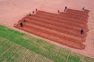 (260226) -- BEIJING, 26 febrero, 2026 (Xinhua) -- Vista aérea tomada con un dron el 25 de febrero de 2026 de agricultores trabajando en los campos de la aldea de Dongwangqu, en la ciudad de Qinyang, en la provincia de Henan, en el centro de China. Tras las vacaciones de la Fiesta de la Primavera, los agricultores están ocupados con la producción agrícola en la temporada agrícola en todo el país.(Xinhua/Yang Fan) (jg) (ah) (vf)