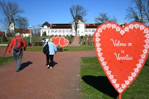 (260226) -- VIROVITICA, 26 febrero, 2026 (Xinhua) -- Personas caminan junto a decoraciones en forma de corazón frente al Castillo de Pejacevic, en Virovitica, Croacia, el 26 de febrero de 2026. La ciudad celebra el mes del amor el jueves. (Xinhua/Damir Speahr/PIXSELL) (jg) (ah) (ce)