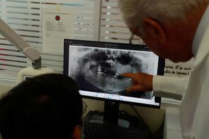 (260226) -- CIUDAD DE MÉXICO, 26 febrero, 2026 -- Imagen del 24 de febrero de 2026 del profesor de tiempo completo de la Facultad de Odontología de la Universidad Nacional Autónoma de México (UNAM) y líder del proyecto, Javier Portilla Robertson (d), observando una imagen obtenida a través del kit de diagnóstico virtual de cáncer bucal, en la Ciudad de México, capital de México. Especialistas de la UNAM desarrollaron el primer kit de diagnóstico virtual de cáncer bucal que, en solo tres pasos y en un plazo de 24 horas, hace posible determinar si una lesión es maligna, lo que favorece la detección oportuna de la enfermedad. (Xinhua/Pool Contreras) (fc) (da) (ra) (vf)