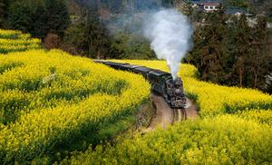 (260227) -- BEIJING, 27 febrero, 2026 (Xinhua) -- Imagen del 26 de febrero de 2026 de un tren turístico de vapor circulando en medio de flores de colza, en el distrito de Qianwei, en Leshan, en la provincia de Sichuan, en el suroeste de China. (Xinhua/Kong Sheng) (rtg) (ra) (ce)