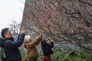 (260227) -- BEIJING, 27 febrero, 2026 (Xinhua) -- Imagen del 26 de febrero de 2026 de turistas tomando fotografías de flores en el parque de las ruinas de la muralla de la ciudad de la dinastía Ming, en Beijing, capital de China. (Xinhua/Liu Mancang) (rtg) (ra) (ce)
