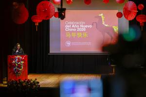 (260227) -- QUITO, 27 febrero, 2026 (Xinhua) -- Imagen del 25 de febrero de 2026 de la codirectora del Instituto Confucio de la Universidad San Francisco de Quito (USFQ), Kiara Guerra, hablando durante la celebración del Año Nuevo chino organizado por el Instituto Confucio de la USFQ, en la ciudad de Quito, capital de Ecuador. El Instituto Confucio de la USFQ celebró la llegada del Año Nuevo chino con un evento cultural que promovió las tradiciones y la riqueza cultural de China, fomentando un ambiente de fraternidad con la comunidad estudiantil ecuatoriana. (Xinhua/Ricardo Landeta) (rl) (rtg) (ra) (vf)