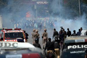 (260301) -- KARACHI, 1 marzo, 2026 (Xinhua) -- Manifestantes se enfrentan con personal policial cerca del Consulado de Estados Unidos, en la ciudad portuaria de Karachi, en el sur de Pakistán, el 1 de marzo de 2026. Al menos nueve personas murieron y más de 12 resultaron heridas el domingo, cuando manifestantes se enfrentaron con las fuerzas del orden fuera del Consulado de Estados Unidos en Karachi, en la provincia meridional paquistaní de Sindh, dijeron funcionarios de rescate. (Xinhua/Imran Ali) (rtg) (da) (ah)