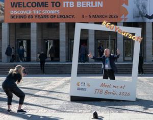 (260303) -- BERLIN, 3 marzo, 2026 (Xinhua) -- Un hombre posa para fotografías afuera de la sede de la feria de viajes ITB Berlín, en Berlín, Alemania, el 3 de marzo de 2026. La feria de viajes ITB Berlín de este año comenzó aquí el martes y durará hasta el 5 de marzo. Llevada a cabo por primera vez en 1966, el evento celebra este año su 60 aniversario. (Xinhua/Zhang Haofu) (jg) (ra) (vf)