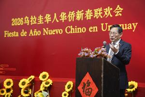 (260302) -- MONTEVIDEO, 2 marzo, 2026 (Xinhua) -- Imagen del 1 de marzo de 2026 del embajador chino en Uruguay, Huang Yazhong, pronunciando un discurso durante los festejos del Año Nuevo chino, en Montevideo, capital de Uruguay. La comunidad china en Uruguay celebró el Año Nuevo Lunar con danzas tradicionales, caligrafía, artes marciales y gastronomía típica, en un multitudinario encuentro en la histórica Casona Mauá, en la ciudad de Montevideo. (Xinhua/Nicolás Celaya) (nc) (rtg) (ah) (ce)
