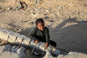 (260304) -- GAZA, 4 marzo, 2026 (Xinhua) -- Imagen del 3 de marzo de 2026 de un niño palestino desplazado visto en medio de tiendas de campaña temporales, en el oeste de la Ciudad de Gaza. (Xinhua/Rizek Abdeljawad) (ah) (ra) (vf)
