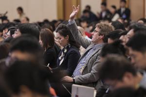 (260306) -- BEIJING, 6 marzo, 2026 (Xinhua) -- Un periodista levanta la mano para realizar preguntas en una conferencia de prensa de la cuarta sesión de la XIV Asamblea Popular Nacional (APN) sobre economía, en Beijing, capital de China, el 6 de marzo de 2026. (Xinhua/Wang Xi) (jg) (ra) (ce)