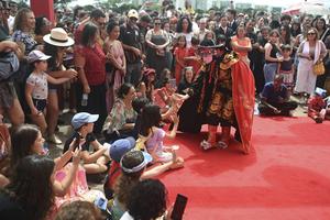 (260308) -- BRASILIA, 8 marzo, 2026 (Xinhua) -- Imagen del 7 de marzo de 2026 de un artista interactuando con niños mientras realiza una presentación durante la celebración del Festival de las Linternas, en Brasilia, Brasil. (Xinhua/Lucio Tavora) (lt) (rtg) (da)