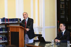 (260307) -- SANTIAGO, 7 marzo, 2026 (Xinhua) -- Imagen del 6 de marzo de 2026 del presidente del Comité de Diálogo Político Chile-China del Congreso chileno, el senador Francisco Chahuán (i), y el embajador chino en Chile, Niu Qingbao (d), participando durante la presentación del libro "Chile y China en perspectiva parlamentaria" en la Sala de Lectura de la Biblioteca del Congreso Nacional de Chile, en Santiago, capital de Chile. El Congreso chileno presentó el viernes el libro "Chile y China en perspectiva parlamentaria", un texto que sirve como hoja de ruta para el periodo 2026-2030, al proyectar la relación de este Parlamento con la nación asiática. (Xinhua/Jorge Villegas) (jv) (rtg) (da)