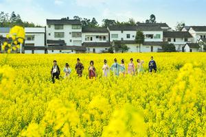 (260308) -- BEIJING, 8 marzo, 2026 (Xinhua) -- Imagen del 5 de marzo de 2026 de turistas portando vestimentas tradicionales mientras caminan entre campos de flores de colza, en la ciudad de Guang'an, en la provincia de Sichuan, suroeste de China. (Xinhua/Zhang Guosheng) (da) (ah)