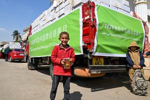 (260310) -- GIZA, 10 marzo, 2026 (Xinhua) -- Imagen del 9 de marzo de 2026 de un niño visto cerca de camiones cargados con cajas de artículos donados durante un evento de donación, en Giza, Egipto. La Cámara de Comercio China en Egipto y la Asociación Egipcia Orman celebraron conjuntamente el lunes un evento de donación en la Gobernación de Giza para ayudar a las familias egipcias necesitadas. (Xinhua/Xin Mengchen) (ah) (vf)