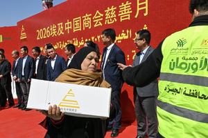 (260310) -- GIZA, 10 marzo, 2026 (Xinhua) -- Imagen del 9 de marzo de 2026 de una mujer recibiendo una caja de artículos donados durante un evento de donación, en Giza, Egipto. La Cámara de Comercio China en Egipto y la Asociación Egipcia Orman celebraron conjuntamente el lunes un evento de donación en la Gobernación de Giza para ayudar a las familias egipcias necesitadas. (Xinhua/Xin Mengchen) (ah) (vf)