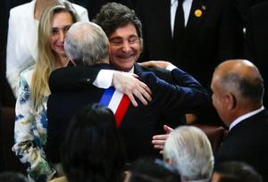 (260311) -- VALPARAISO, 11 marzo, 2026 (Xinhua) -- Imagen cedida por AGENCIAUNO del presidente chileno, José Antonio Kast (c-frente), abrazándose con el presidente argentino, Javier Milei (c-atrás), durante su ceremonia de toma de posesión en el Salón de Honor del Congreso Nacional, en Valparaíso, Chile, el 11 de marzo de 2026. José Antonio Kast Rist asumió el miércoles de manera oficial la Presidencia de Chile para el período 2026-2030, de manos del saliente mandatario Gabriel Boric (2022-2026), en una ceremonia realizada en el Salón de Honor del Congreso Nacional, en la histórica ciudad porteña de Valparaíso. (Xinhua/AGENCIAUNO) (ah) (ra) (ce)