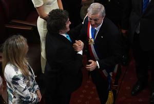 (260311) -- VALPARAISO, 11 marzo, 2026 (Xinhua) -- Imagen cedida por AGENCIAUNO del presidente chileno, José Antonio Kast (d), estrechando la mano del presidente argentino, Javier Milei (c), durante su ceremonia de toma de posesión en el Salón de Honor del Congreso Nacional, en Valparaíso, Chile, el 11 de marzo de 2026. José Antonio Kast Rist asumió el miércoles de manera oficial la Presidencia de Chile para el período 2026-2030, de manos del saliente mandatario Gabriel Boric (2022-2026), en una ceremonia realizada en el Salón de Honor del Congreso Nacional, en la histórica ciudad porteña de Valparaíso. (Xinhua/AGENCIAUNO) (ah) (ra) (ce)